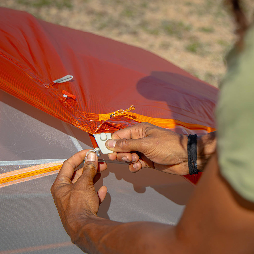 - Proprietary tent corner construction with unique TipLok Tent Buckle™ to streamline tent set-up by combining three functions: secure pole-tip capture, rainfly attachment and tensioner, and stake-out loop