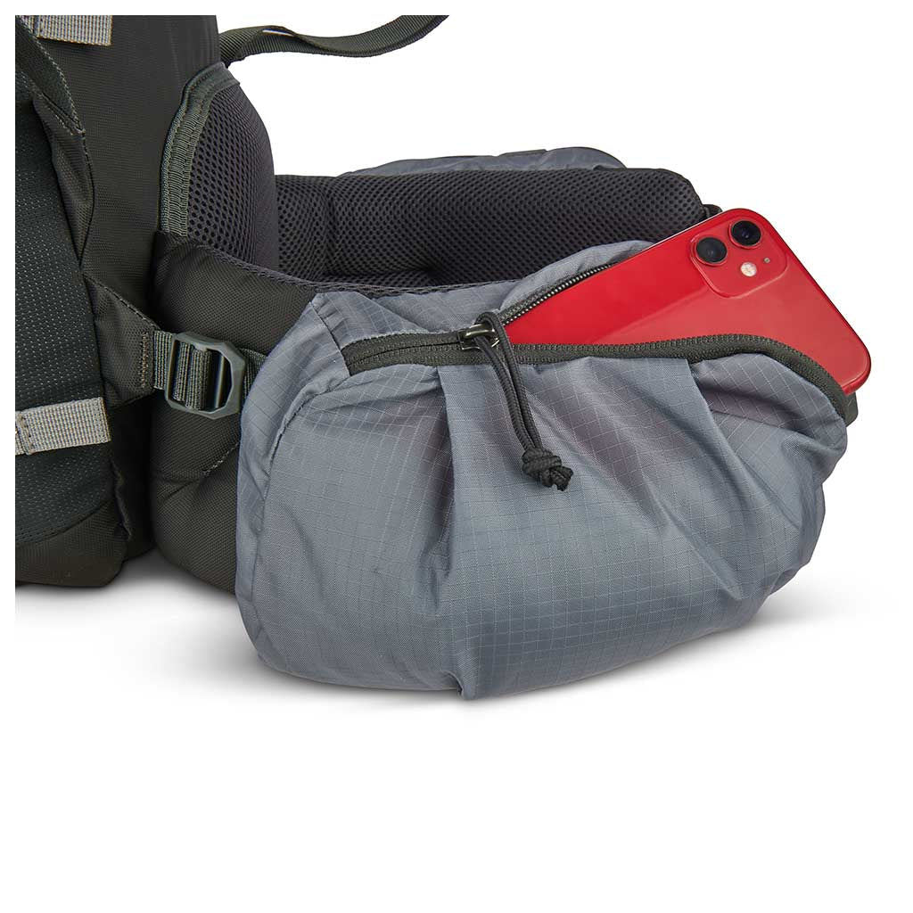 • Zip pockets on hip belt and stretch mesh side pockets for water bottles