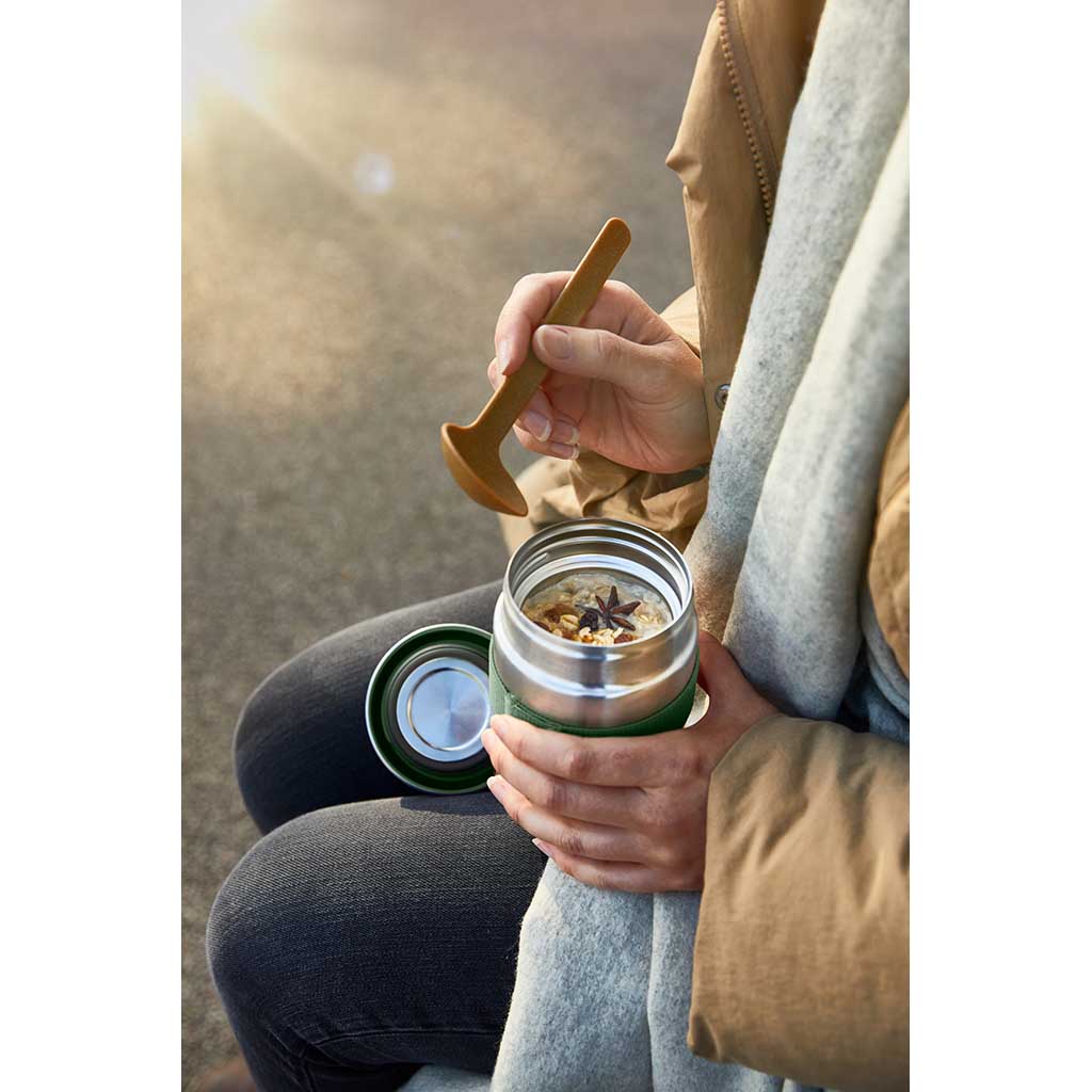 • Natural wood fibre spoon slots into elastic strap