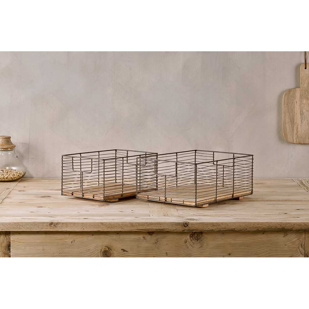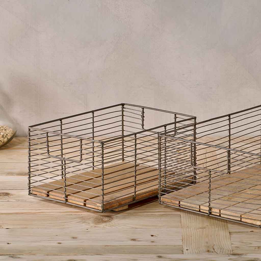 - Wire-sculpted iron baskets with sustainable mango wood bases