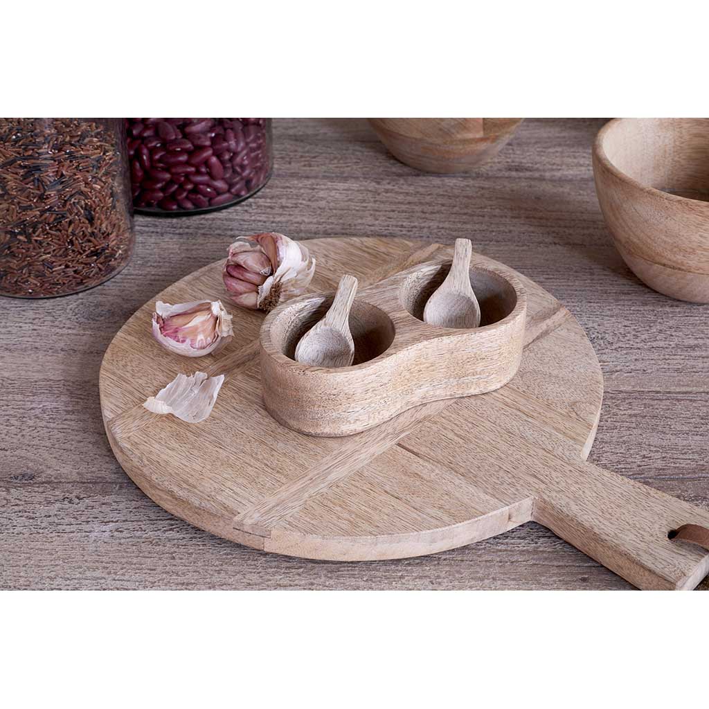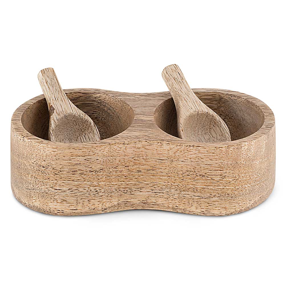 • Carved mango wood salt and pepper server with matching scoop spoons