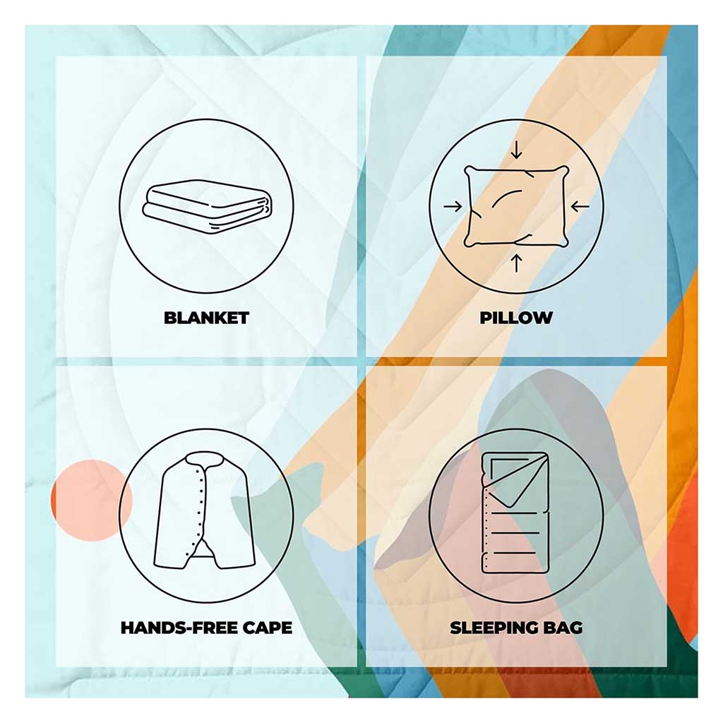 • Versatile 4-in-1 blanket that also functions as a soft pillow, a hands-free cape and even snaps together to form a sleeping bag