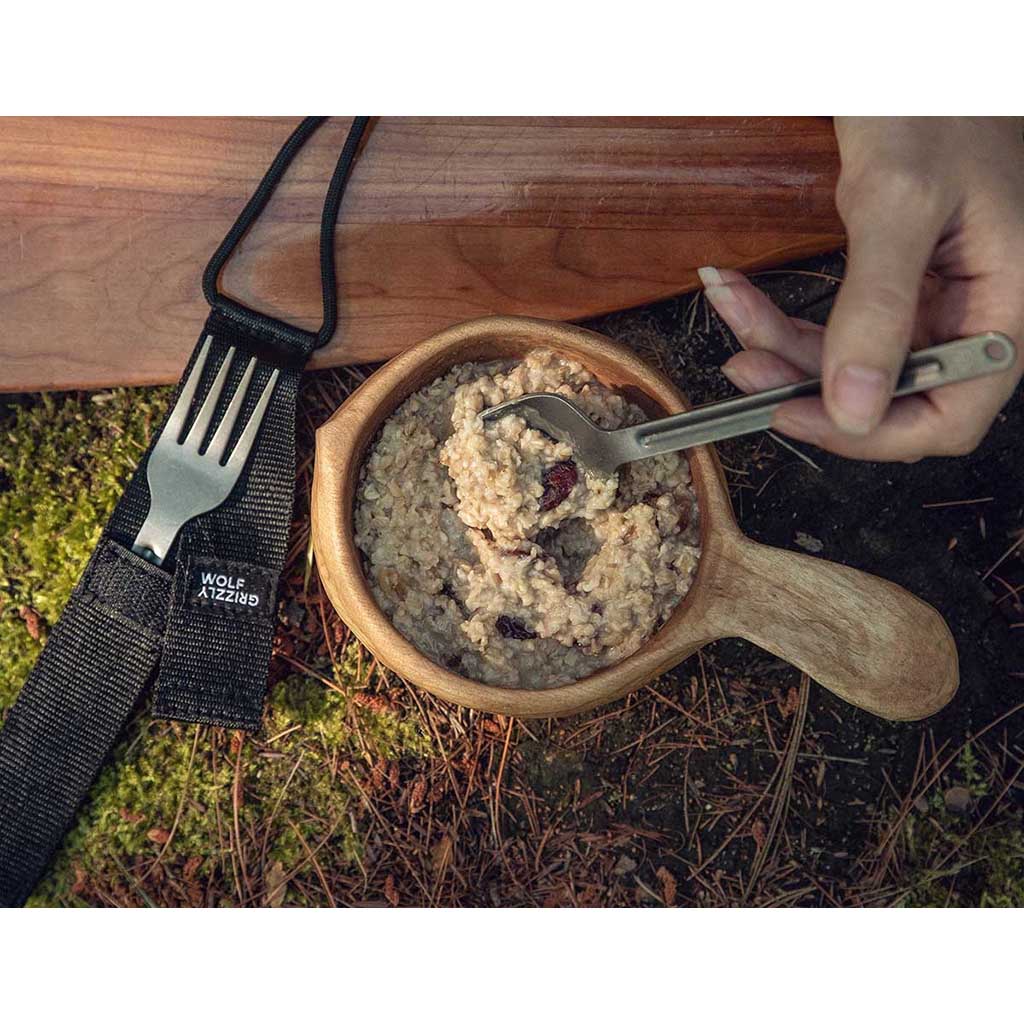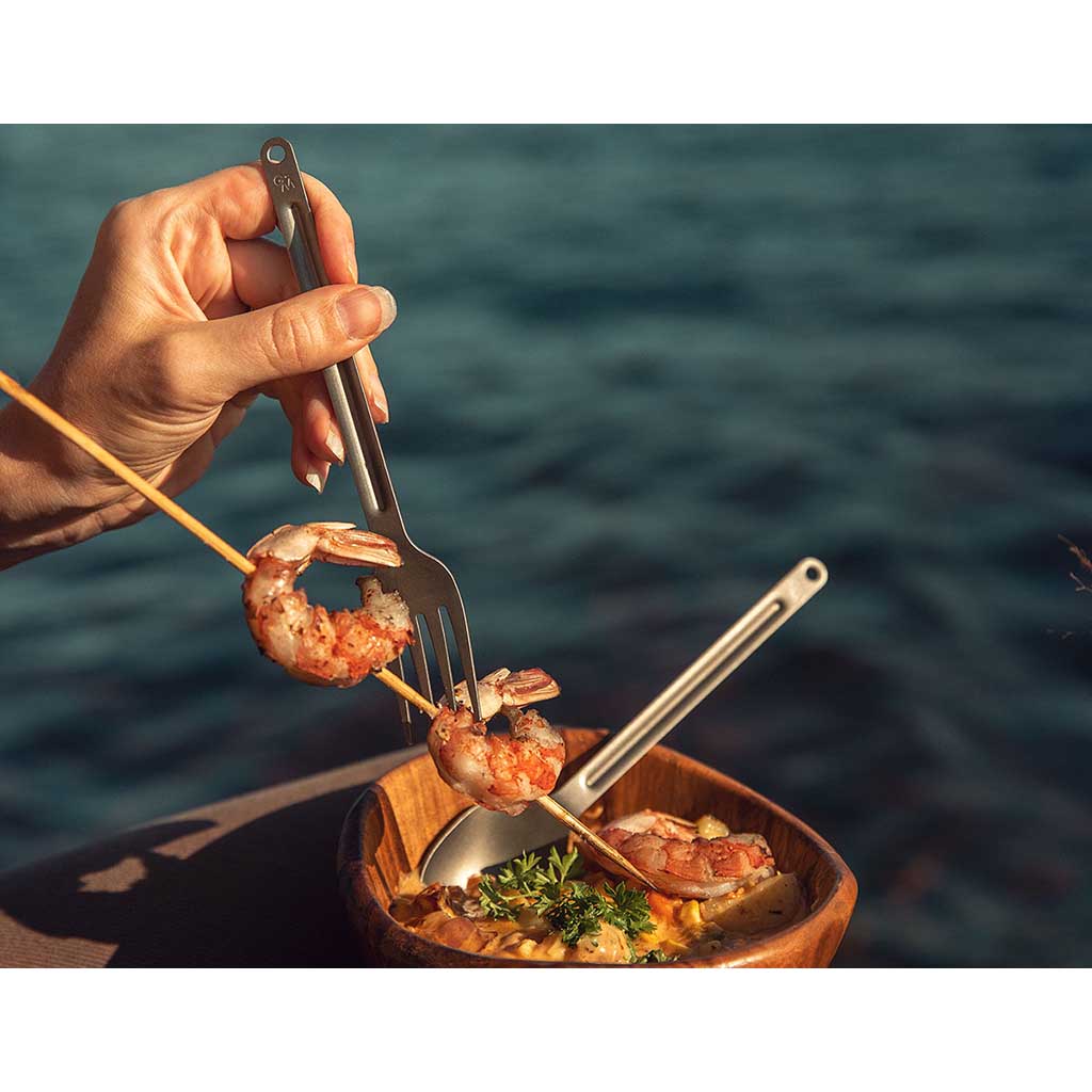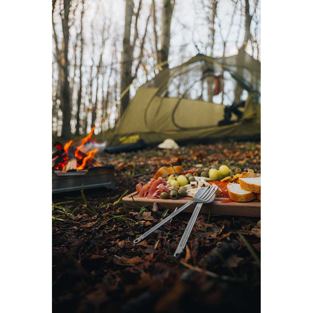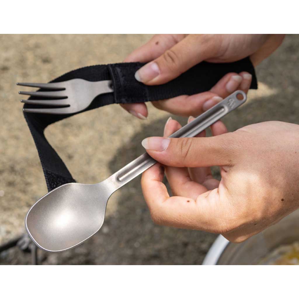 Made from a single piece of titanium, this camp cutlery set is corrosion-resistant, lightweight and strong. Thoughtfully designed with no coatings or chemical finishes - just clean, smooth titanium. Both the fork and spoon have a stamped rib for extra rigidity and to allow the cutlery to nest together for compact carrying. Use the included carrying case, or attach your cutlery to a carabiner, keychain, etc.