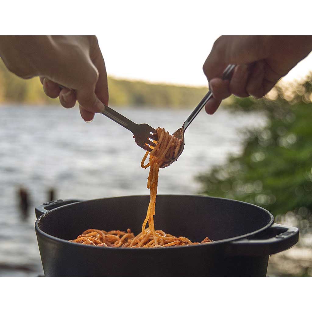 • Both the fork and spoon have a stamped rib for extra rigidity and to allow the cutlery to nest together for compact carrying