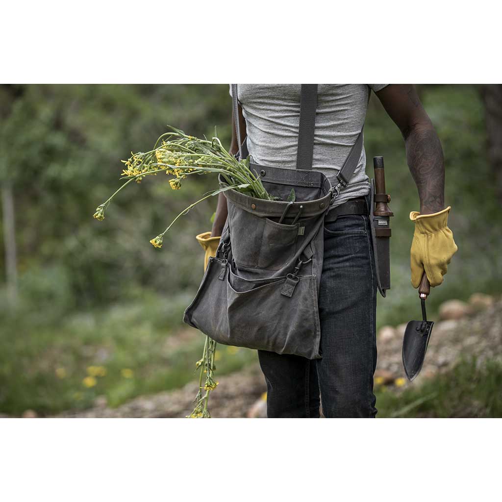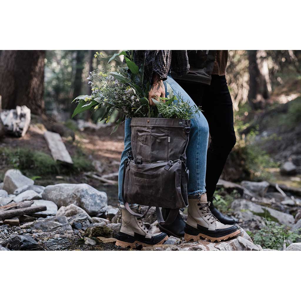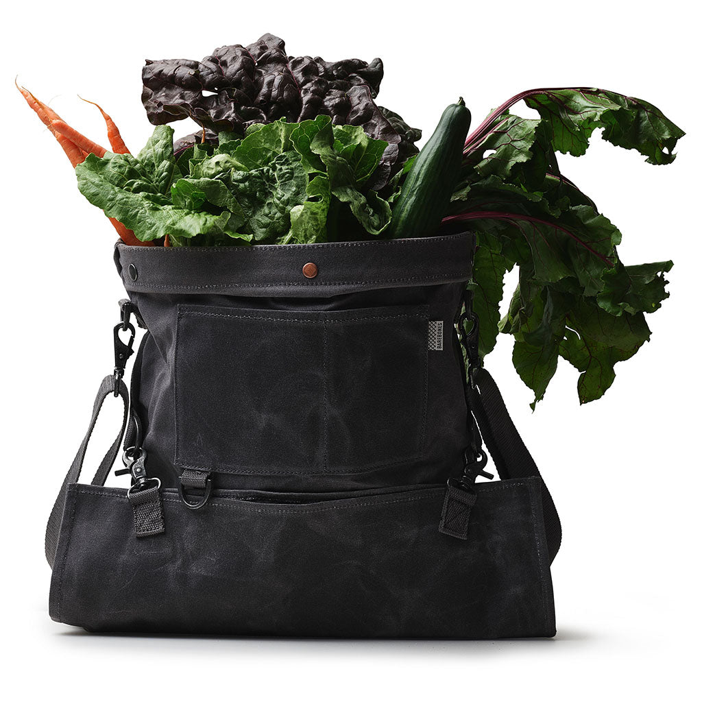 Whether you’re perusing local produce at the farmers’ market, picking fruit and vegetables from your garden or allotment, or foraging in the wild, this vintage-style ‘harvest bag’ is the perfect companion. The design is inspired by traditional soft bucket bags that were used for centuries by farmers, foragers and orchard and vineyard workers to easily and quickly collect and harvest crops. Typically, they were worn at the hip, so workers could stand or squat yet still work efficiently with their hands. This modern reinterpretation is even more versatile. Convertible straps allow for comfortable carry across the chest or on your back, while a drop-out bottom makes quick work of emptying the harvest. Constructed from weather- and water-resistant waxed canvas and complete with a watertight removable liner, the Gathering Bag is the essential partner for picking, foraging and shopping.