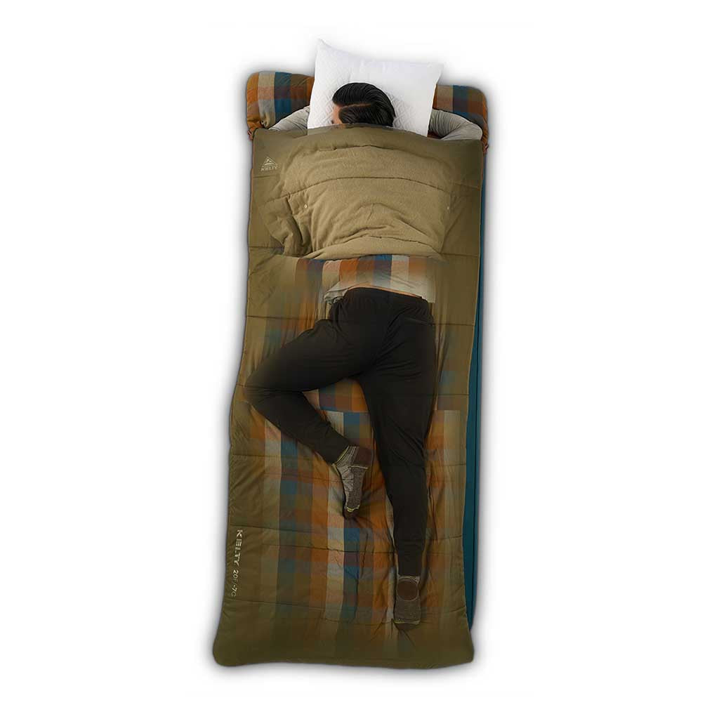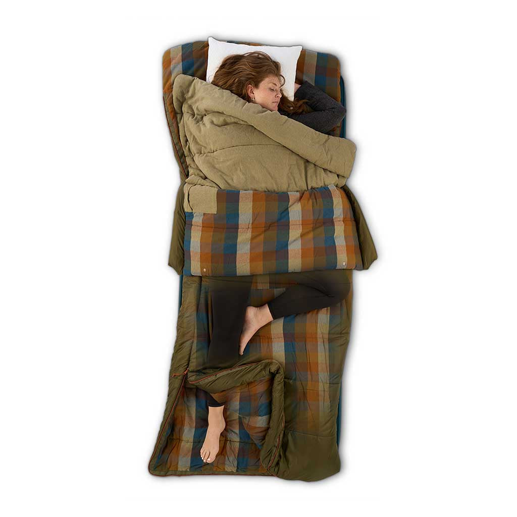 Mummy-shaped sleeping bags are all about maximising thermal efficiency. Which is all well and good when you’re halfway up a mountain, but not really necessary if you’re just chilling out at basecamp. They also tend to feel restrictive and uncomfortable – kinda like sleeping in a football sock. The Wayback is different. It’s a rectangular sleeping bag designed with bed-like comfort in mind. Its oversized cut and insulated built-in blanket deliver cosy warmth and total climate control in any position. Zip it up to your chin, wrap it around your shoulders or fold the top back to suit how you like to sleep (on your back, side, front or even spread out like a spatchcocked chicken). It’s super-soft too, with a soft, organic cotton flannel blanket and liner that feels just like your duvet at home.